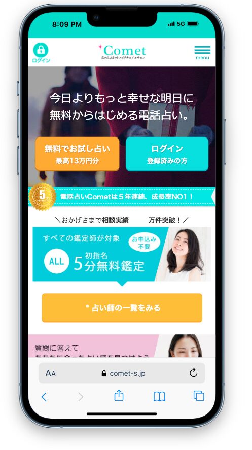 電話占いコメットは、24時間いつでも本格鑑定が受けられ、初回指名5分無料など初心者にも優しい特典が充実しています。