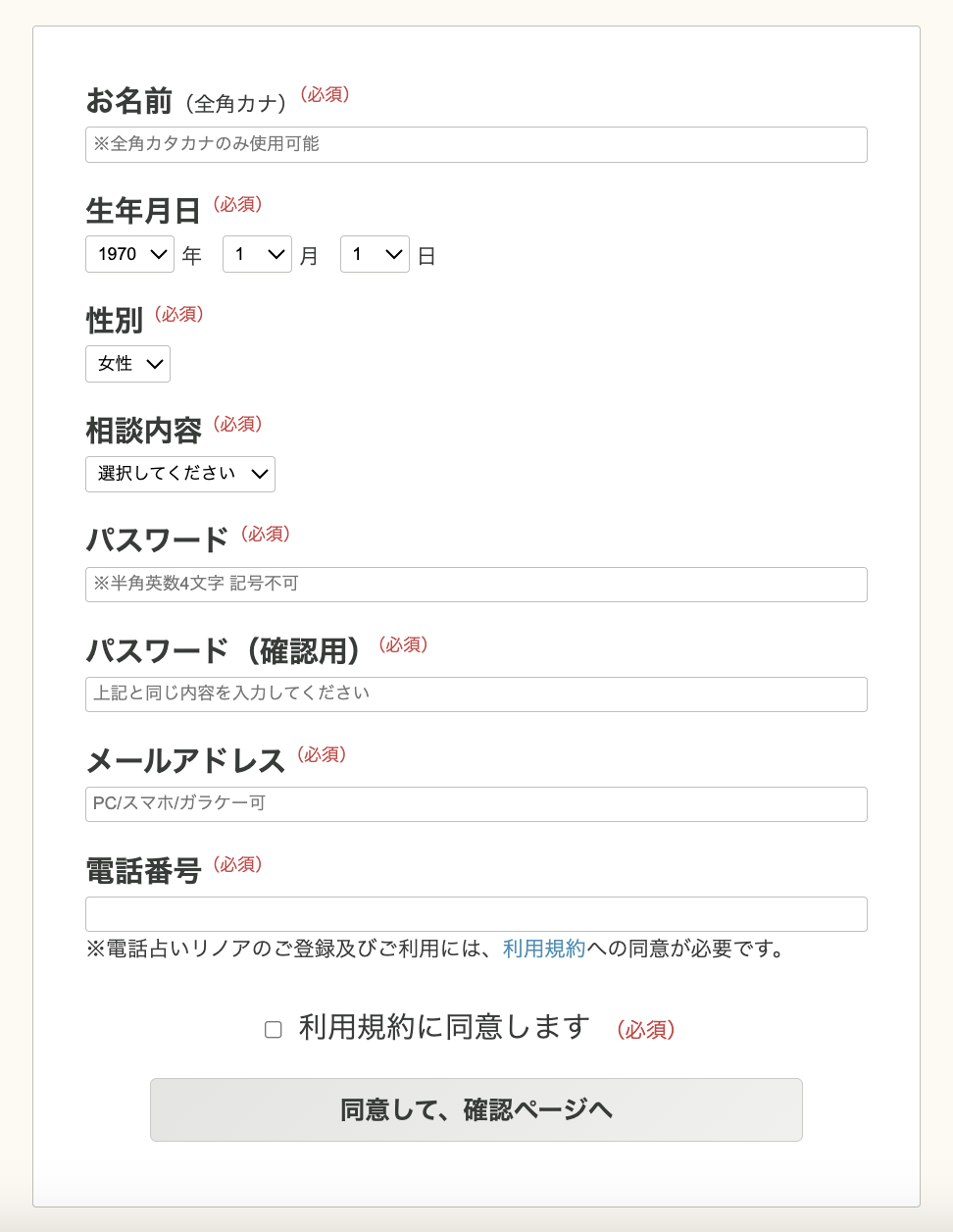 - 名前・生年月日・相談内容・パスワード・メールアドレス・電話番号を入力